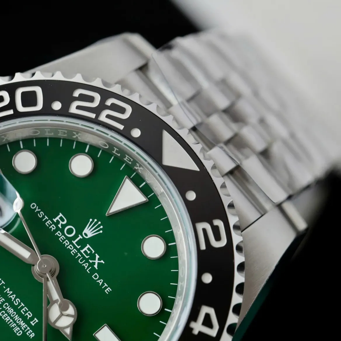 Elevate your wrist game with the Replica Rolex GMT-Master II 126729VTNR “Absinthe”—a masterful tribute to the iconic Swiss timepiece, crafted to mirror the original’s luxury and functionality. Boasting a 40 mm case forged from premium 18k white gold, this replica captures the sleek elegance of the genuine model, paired with a matching 18k white gold Jubilee band for exceptional comfort and timeless style. The dial takes center stage with a striking green ceramic finish, evoking the allure of absinthe, while the scratch-resistant sapphire crystal ensures long-lasting clarity and protection. Powered by a reliable Swiss ETA automatic (kinetic) movement, it delivers precise timekeeping, including GMT functionality for global travelers. With a water resistance rating of up to 30 meters, this Replica Rolex seamlessly blends everyday practicality with high-end aesthetics, making it a standout choice for watch enthusiasts seeking luxury without compromise.