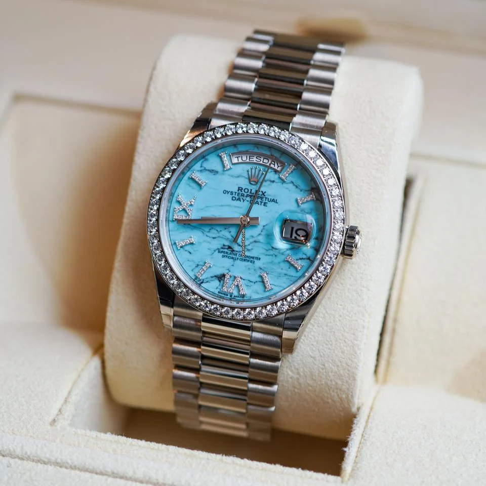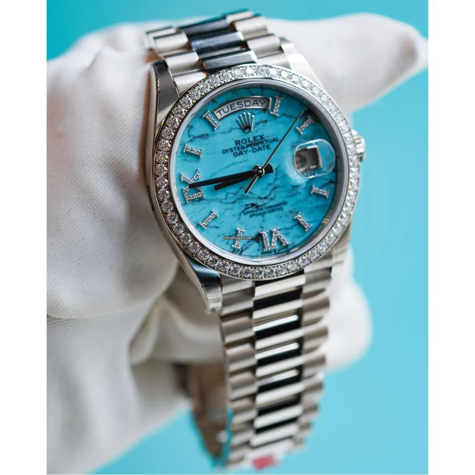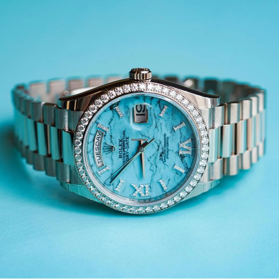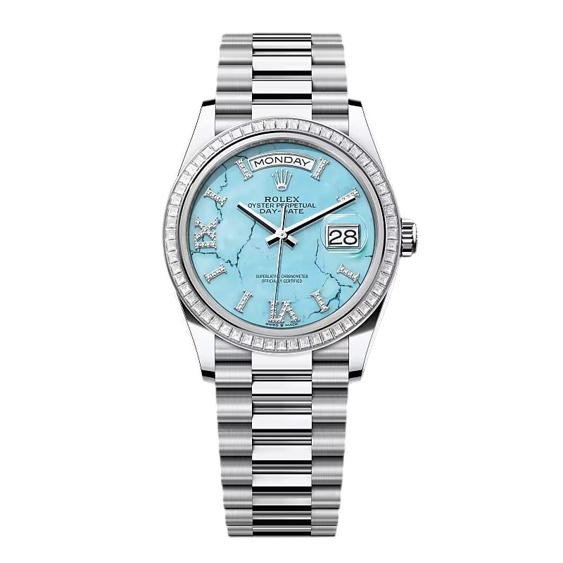 The Rolex Oyster Perpetual Day-Date 36 in platinum, with a turquoise, diamond-set dial, diamond-set bezel and a President bracelet.