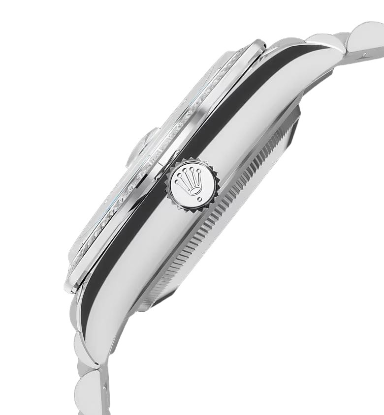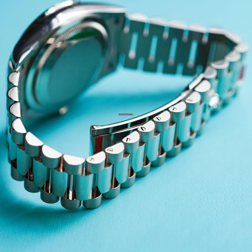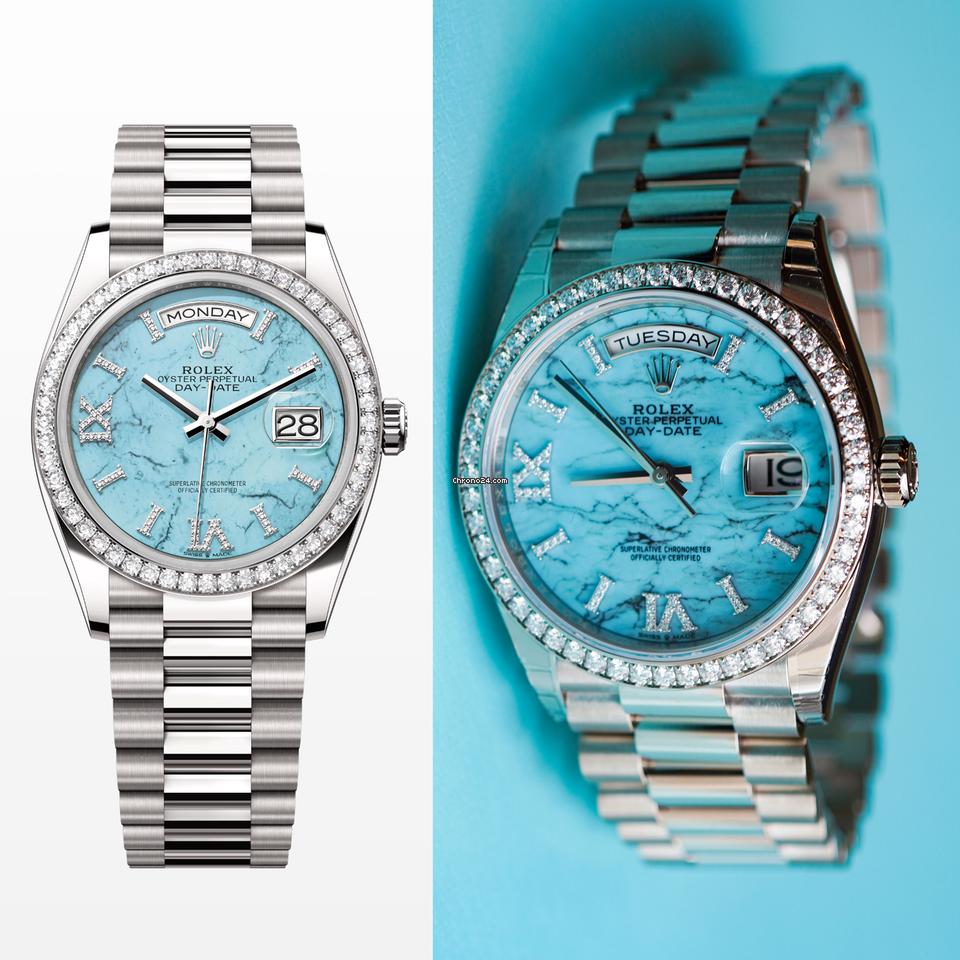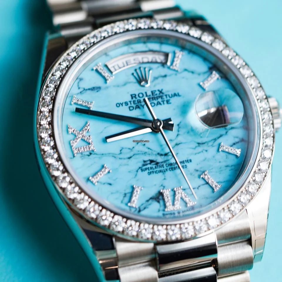 The Rolex Oyster Perpetual Day-Date 36 in platinum, with a turquoise, diamond-set dial, diamond-set bezel and a President bracelet.