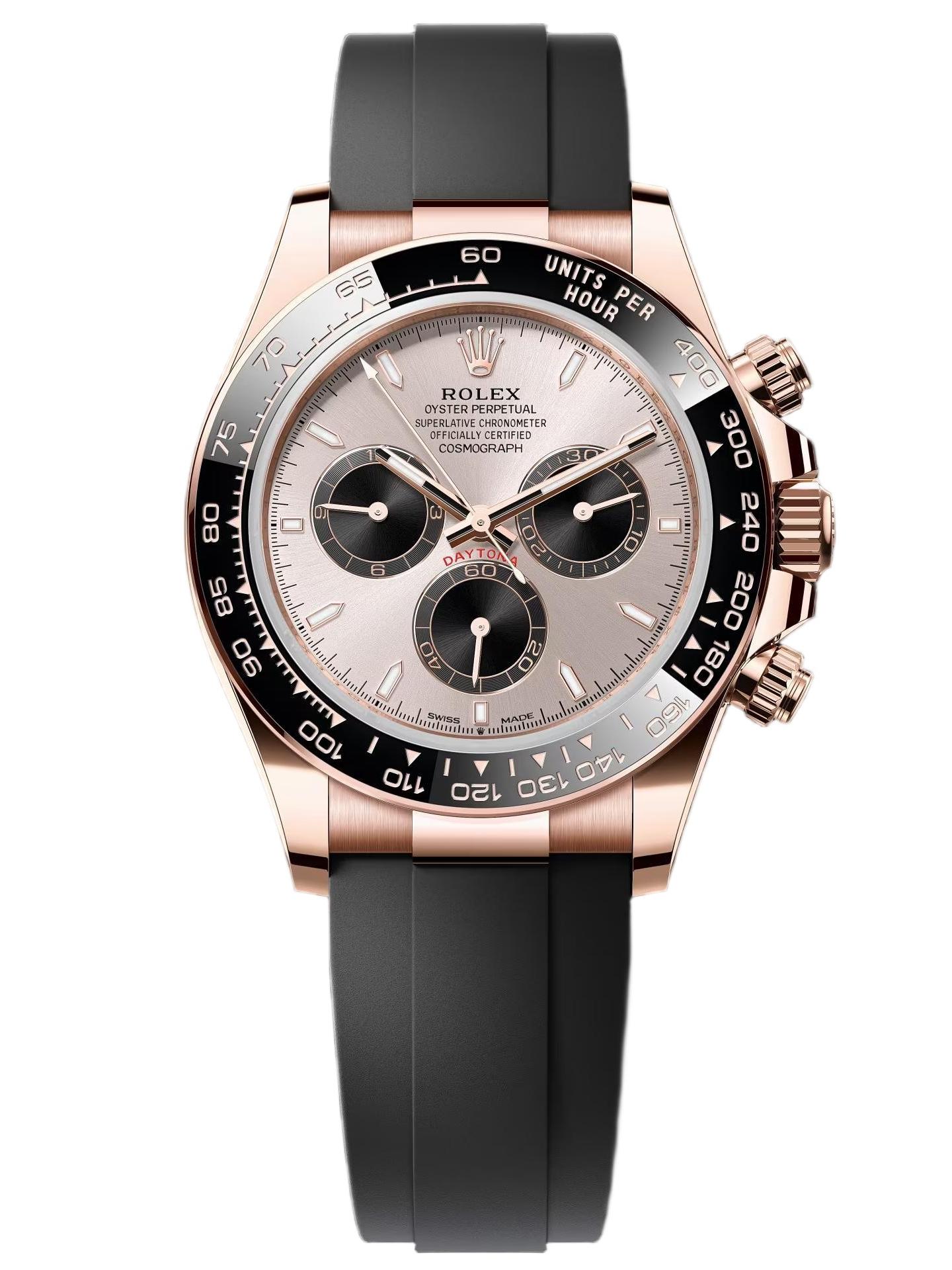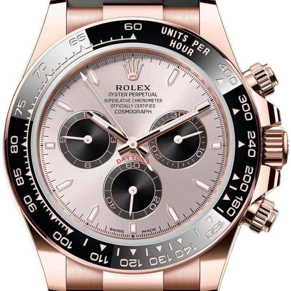 Replica Rolex Daytona 126515LN (40mm men’s): 18k Everose gold case, black Cerachrom bezel, diamond-set dial, Oysterflex band & sapphire crystal. Superclone: Dandong 4130/4131/4132 movement (72h power), 904L steel, 50m water resistance, ±5g weight. AAA: ETA 7750 clone (40h power), 316L steel, shower/swim-safe water resistance, ±13g weight.