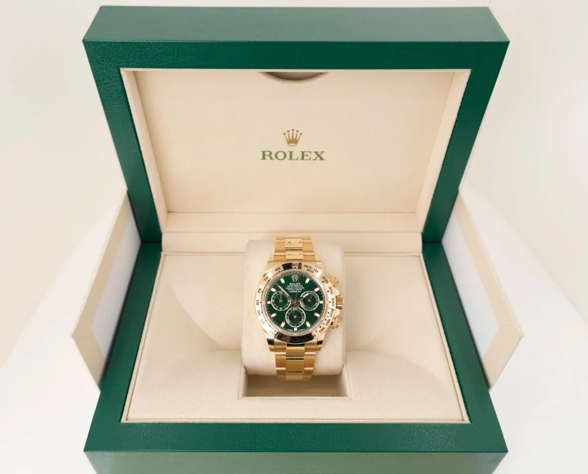 The 40mm Replica Rolex Daytona 116508 combines gold-plated Oyster case/band, a vivid green dial, Swiss (ETA) automatic movement, and sapphire crystal for luxurious everyday style.