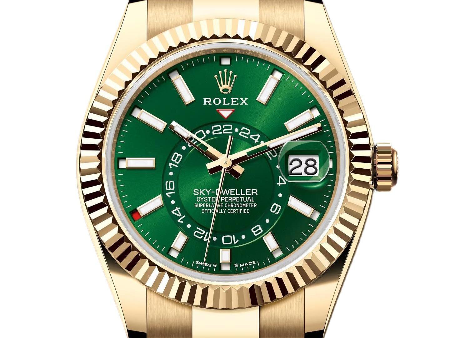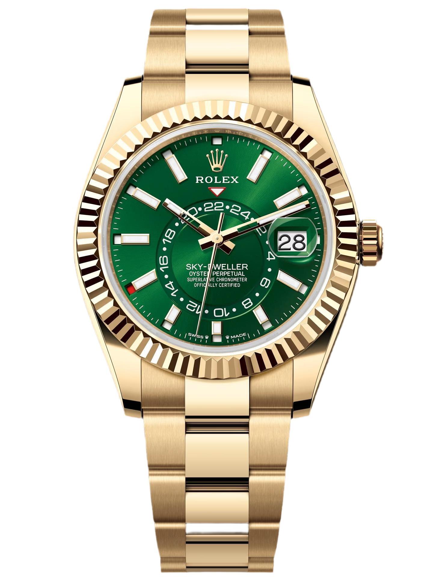 18k gold Rolex Sky-Dweller green dial blends precision movement, timeless beauty & budget-friendly luxury for every occasion.