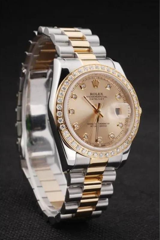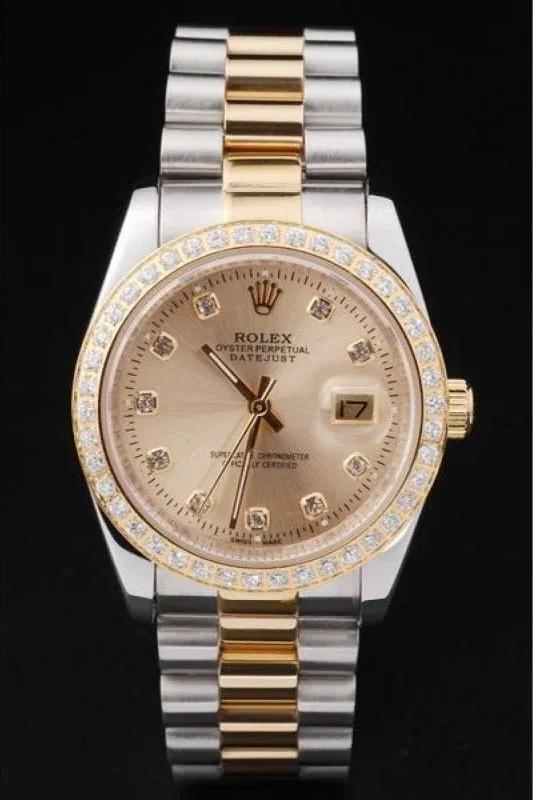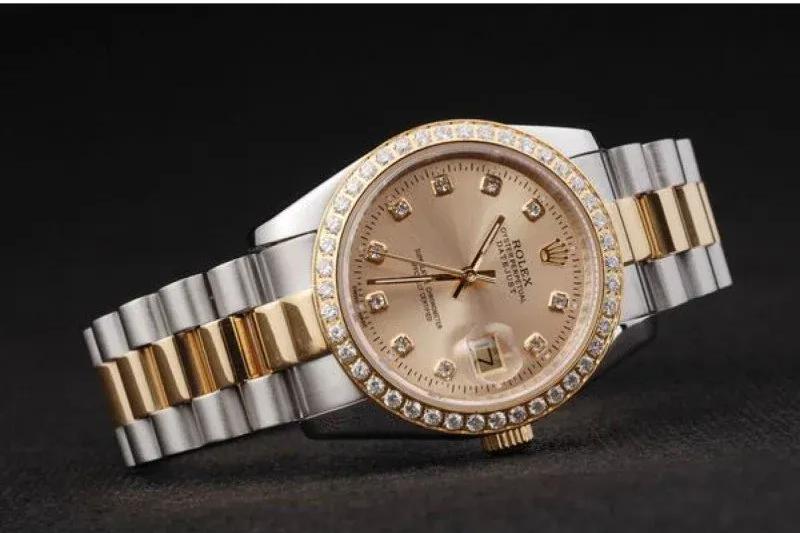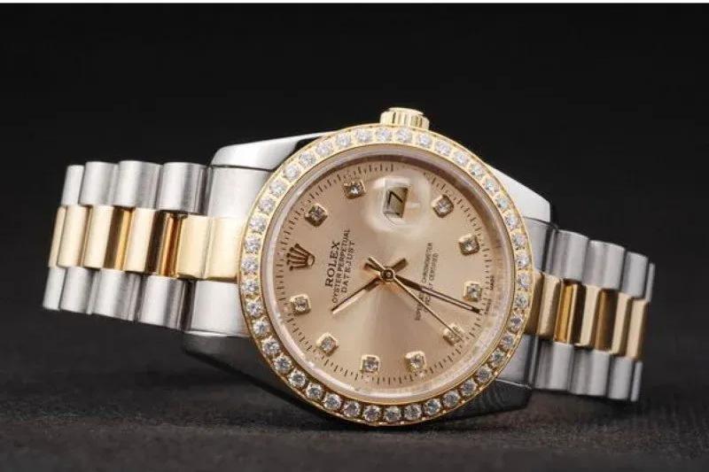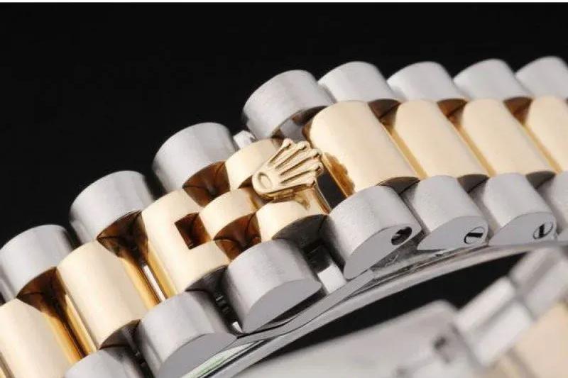 Men’s Superclone Rolex Datejust 36mm Gold Dial SRL40: Swiss ETA automatic movement, polished stainless steel case, two-tone gold-plated band & sapphire crystal. 30m water resistance, 1-year warranty, global free shipping & no-hassle returns.