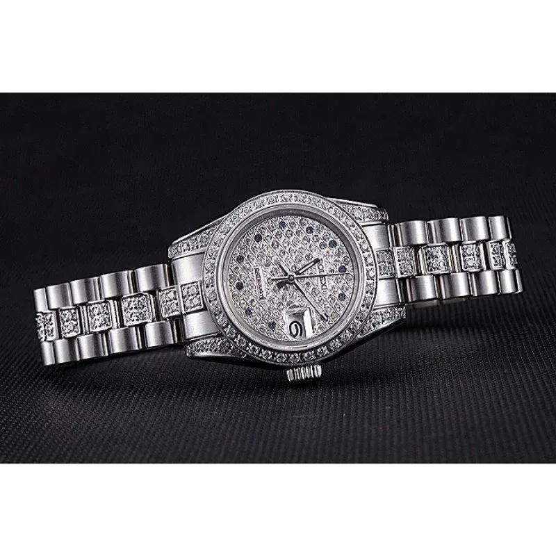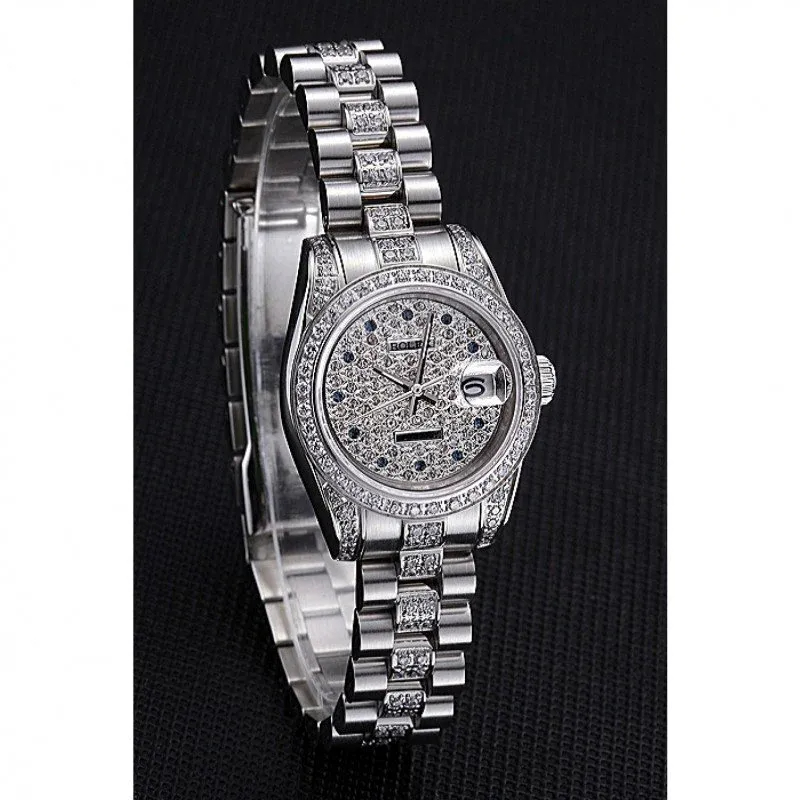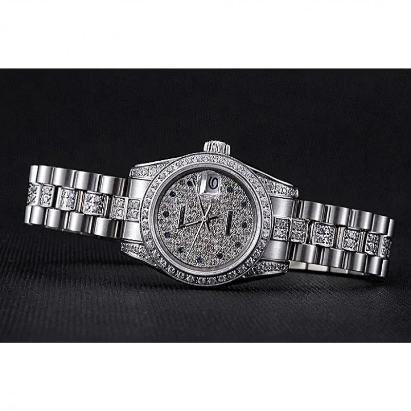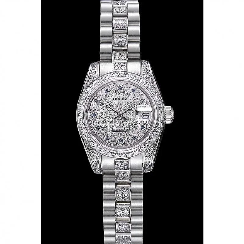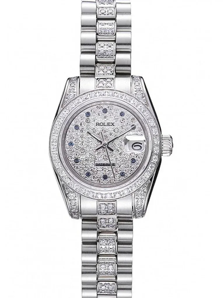 Women’s Rolex Datejust (Ref:622021) – 26mm polished stainless steel case, diamond-set stainless steel band, silver dial, Swiss ETA automatic movement, sapphire crystal, 30m water resistance (SuperClone).