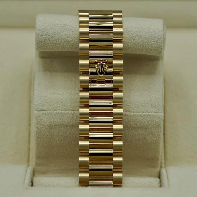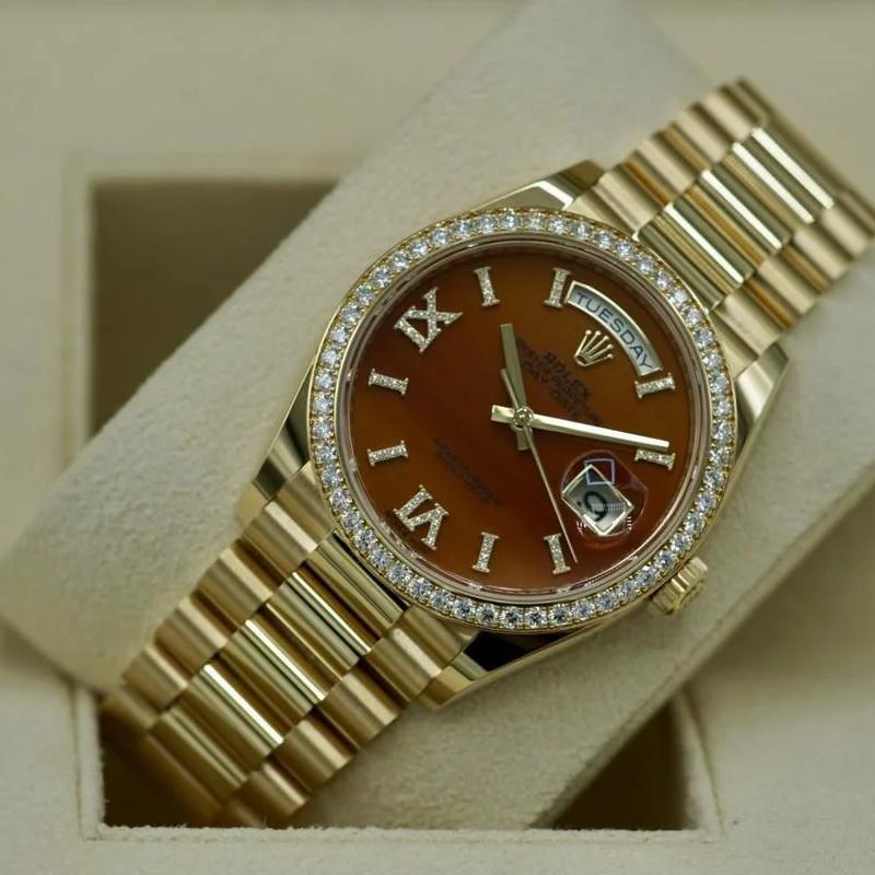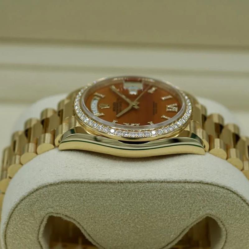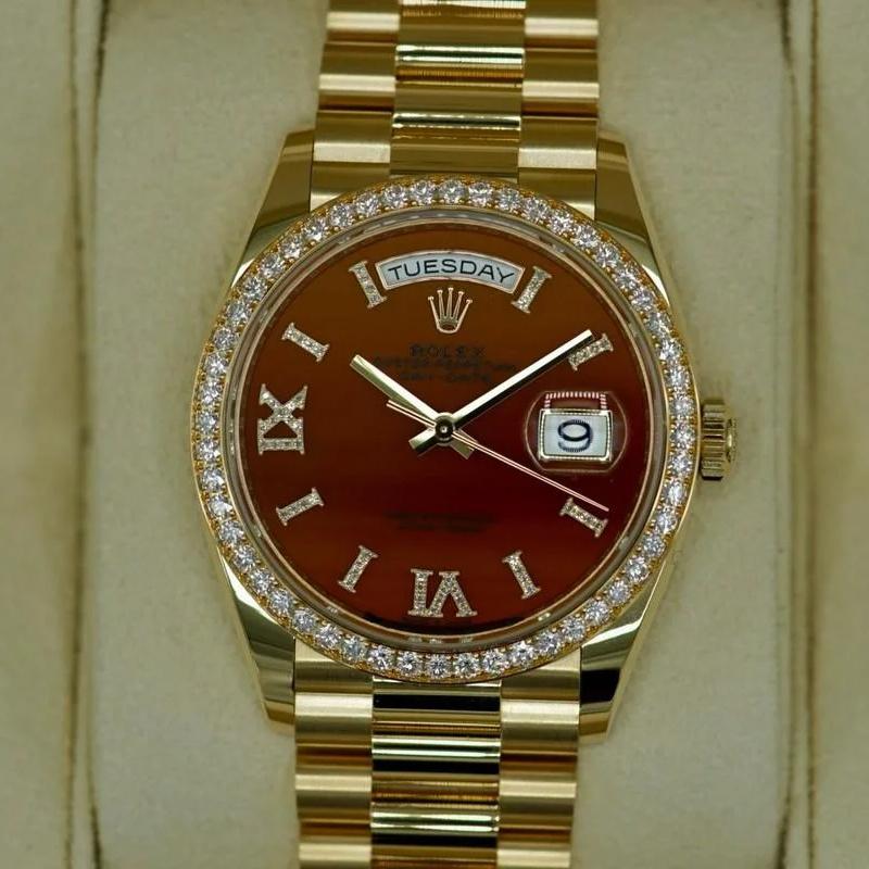 The unisex Rolex Day-Date 36 mm reference 128348RBR exudes timeless luxury with its 18k yellow gold case, diamond-set bezel, and striking carnelian dial adorned with diamonds. Paired with a President semi-circular three-piece link band, it houses a reliable Swiss ETA automatic movement, featuring scratch-resistant sapphire crystal and water resistance up to 30 meters—perfect for both formal occasions and everyday elegance.