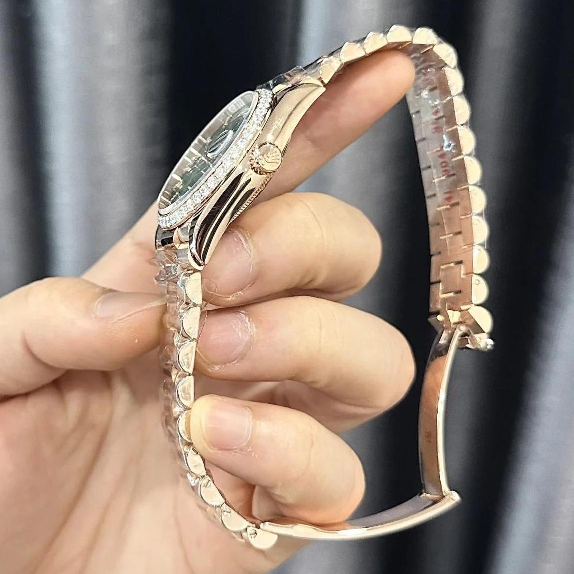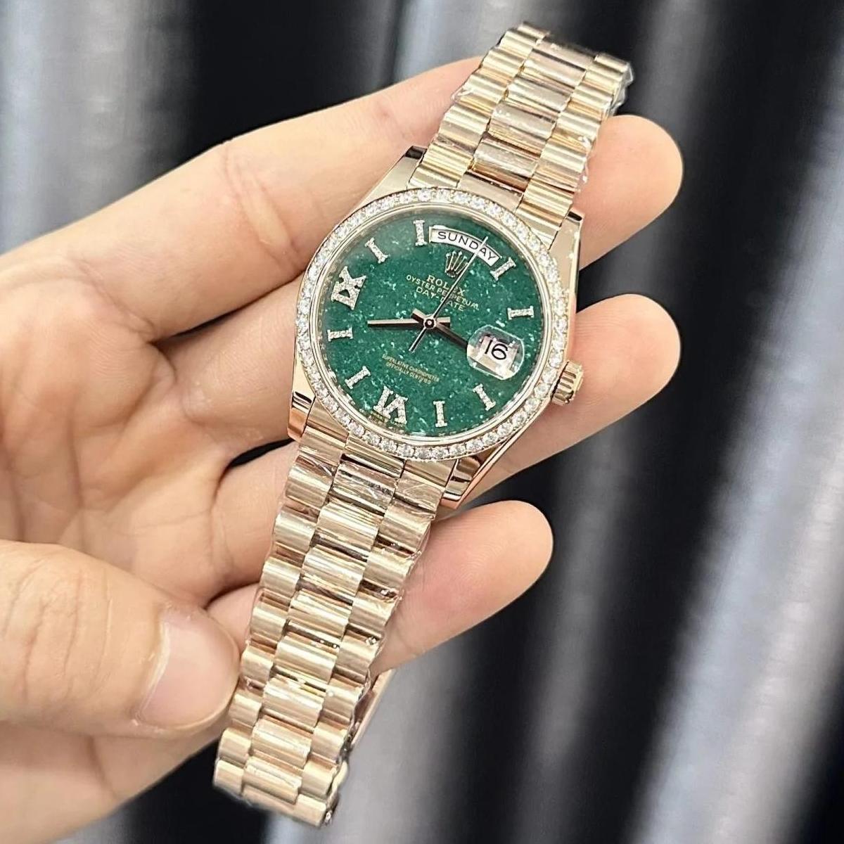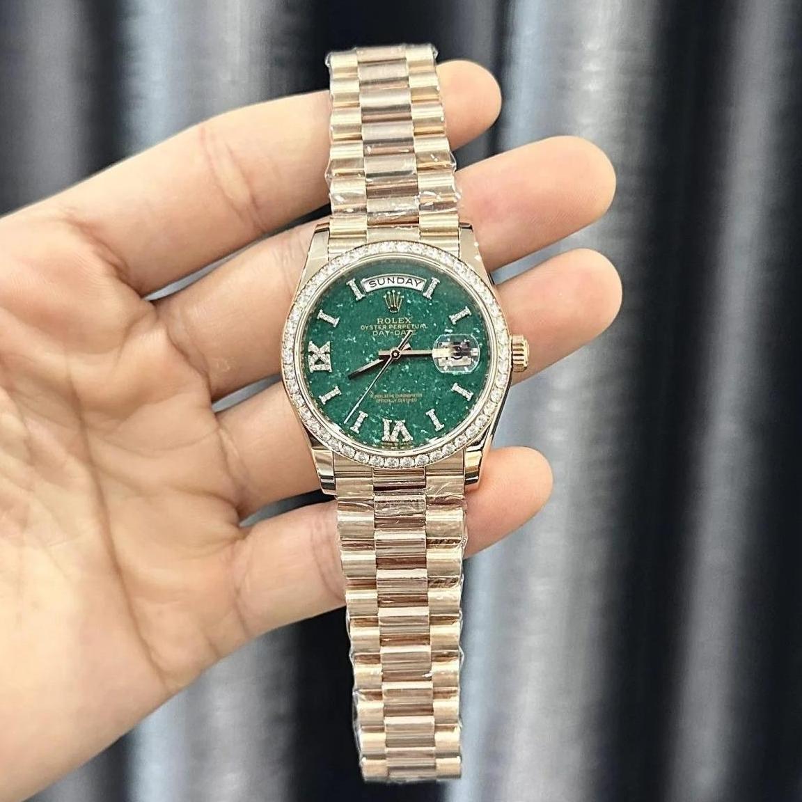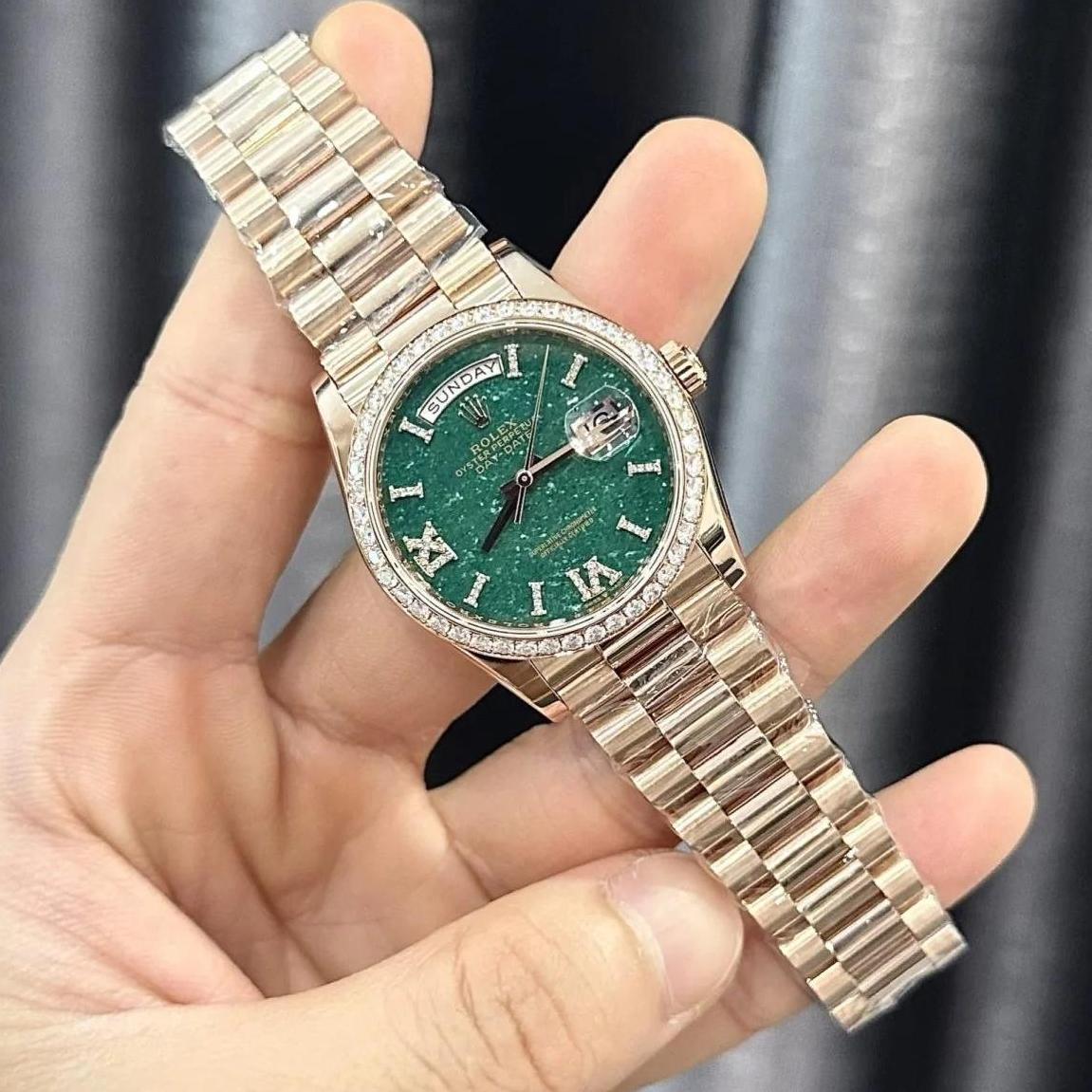 Meet the Superclone Rolex Day-Date 36 mm 128345RBR—a refined men’s timepiece crafted in 18k Everose gold, featuring a fluted diamond-set bezel and a stunning green aventurine dial adorned with diamonds. Powered by a Swiss ETA automatic (kinetic) movement, it pairs with a diamond-set President band and boasts 30-meter water resistance with scratch-resistant sapphire crystal for lasting elegance.